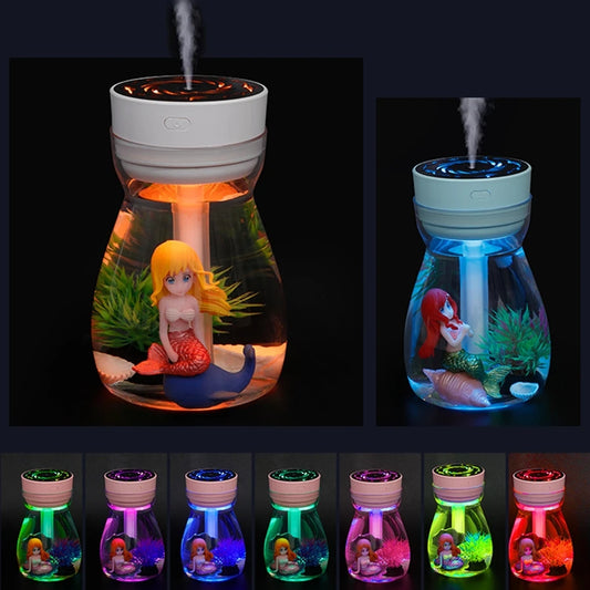 Mini Portable Air Humidifier Mermaid Landscape USB Mist Sprayer Aroma Oil Diffuser with 7 Colors Light Household Air Purifier
