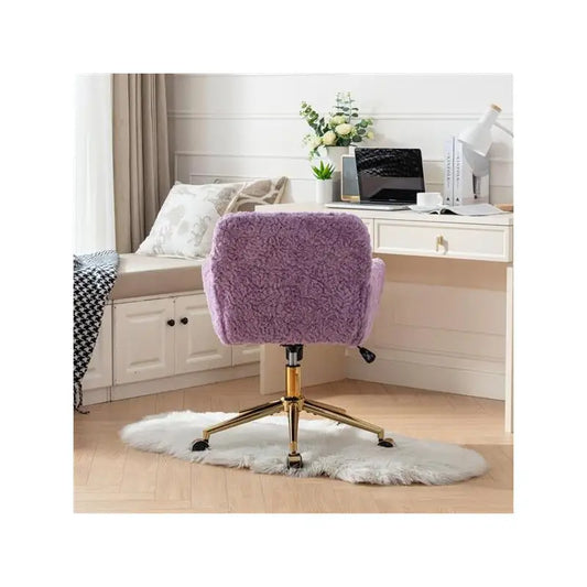 Adjustable Swivel Office Chair with Golden Base, Faux Rabbit Hair Upholstered Desk Chair, Vanity Chair in Violet